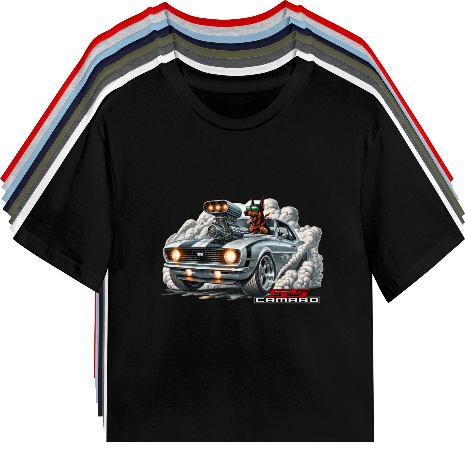 Feel the thrill of raw muscle power every time you throw this tee on. The Burnout Beast design showcases a classic SS Camaro lighting up the asphalt in full burnout style—supercharged engine roaring, tires smoking, and a fierce canine co-pilot at the wheel.
