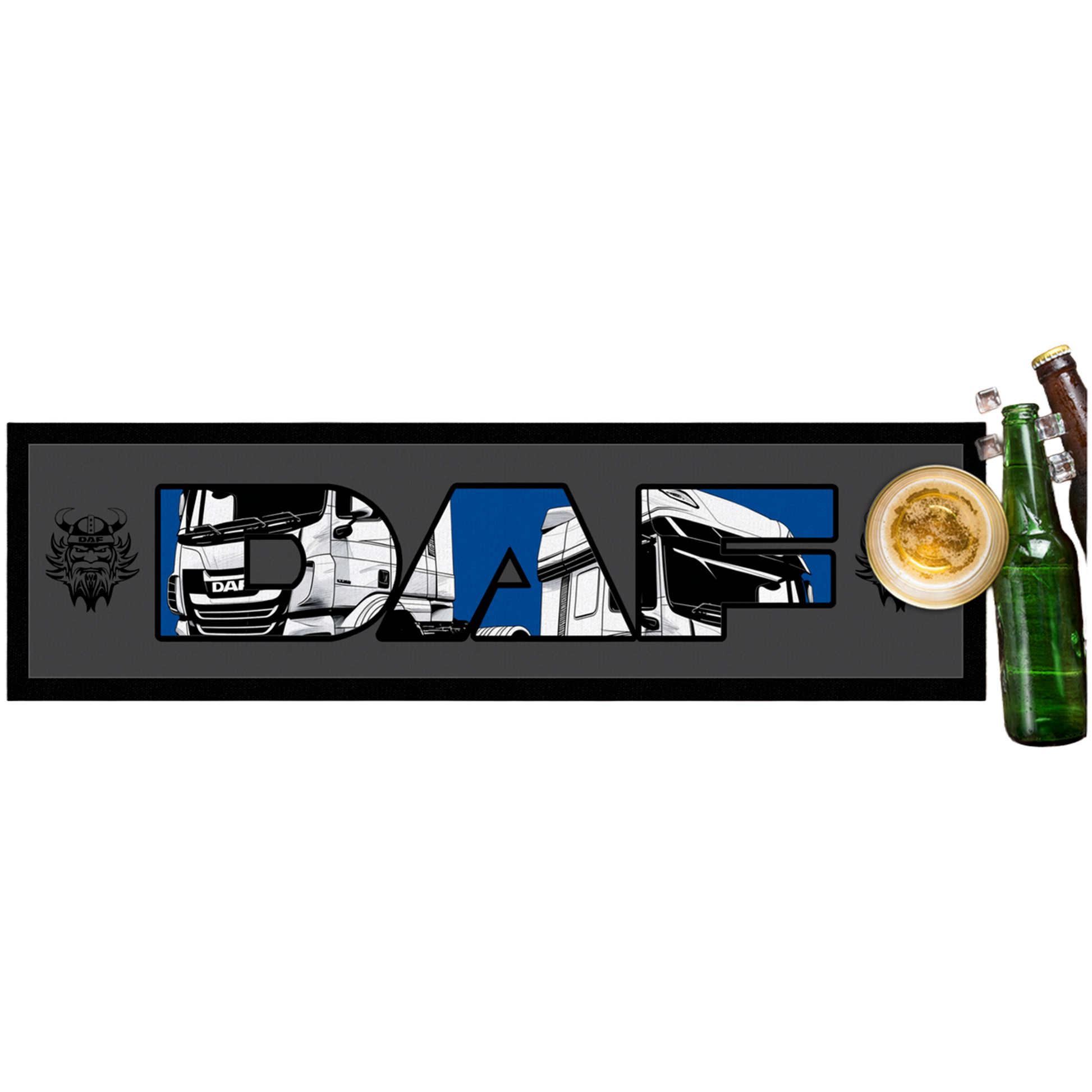 Bring some serious DAF attitude to your bar, shed, or man-cave with this custom DAF Bar Mat featuring premium cartoon-style truck illustrations. The detailed artwork fills each letter of the DAF logo, creating a bold cut-out effect that instantly stands out. Finished with a sleek grey base, black edging, and the iconic Viking emblem, this design is made for true DAF fans.