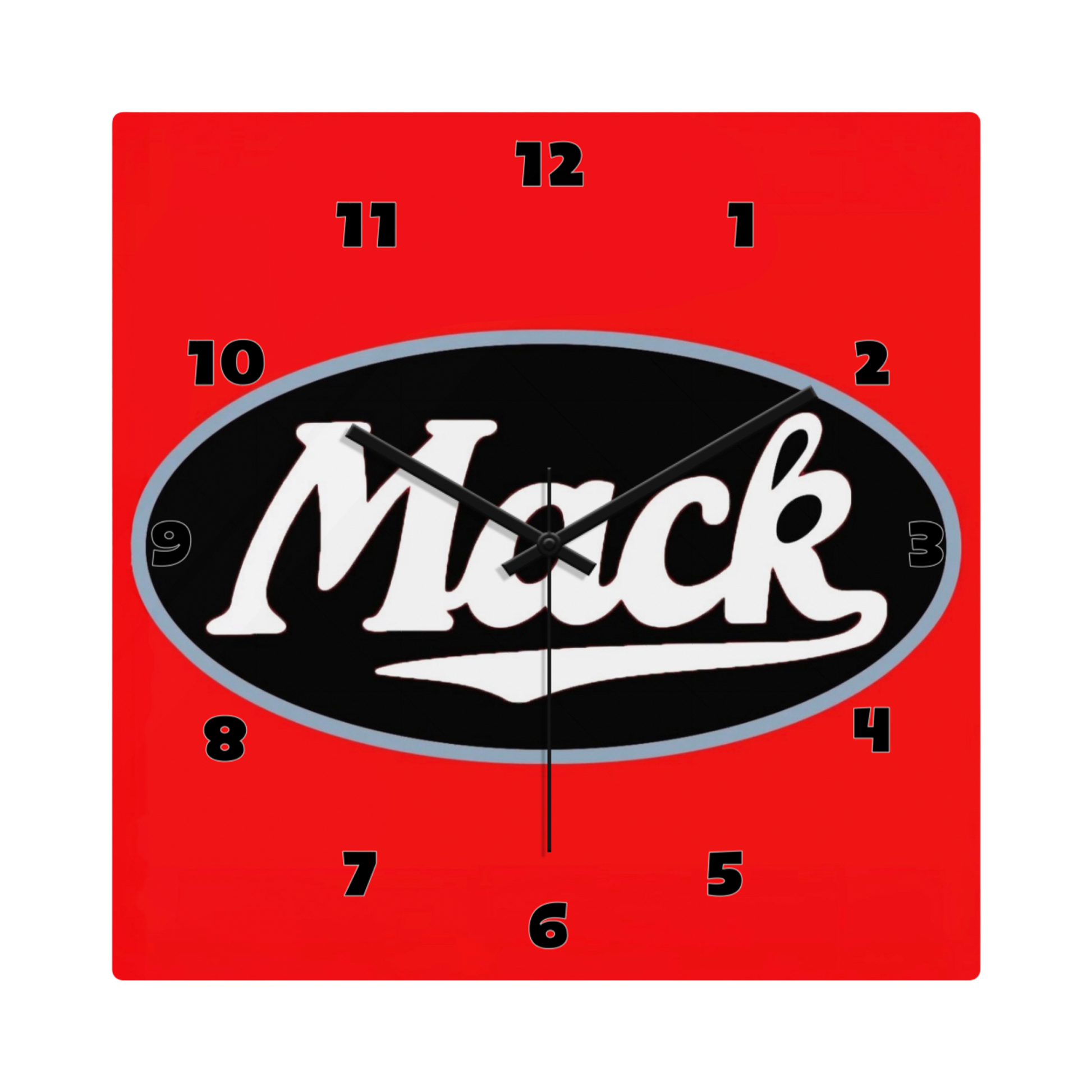 Celebrate the power and legacy of Mack trucks with this striking square wall clock. Featuring the unmistakable Mack logo in bold white script against a black oval background, set on a vibrant red face, this clock is a must-have for any Mack enthusiast.