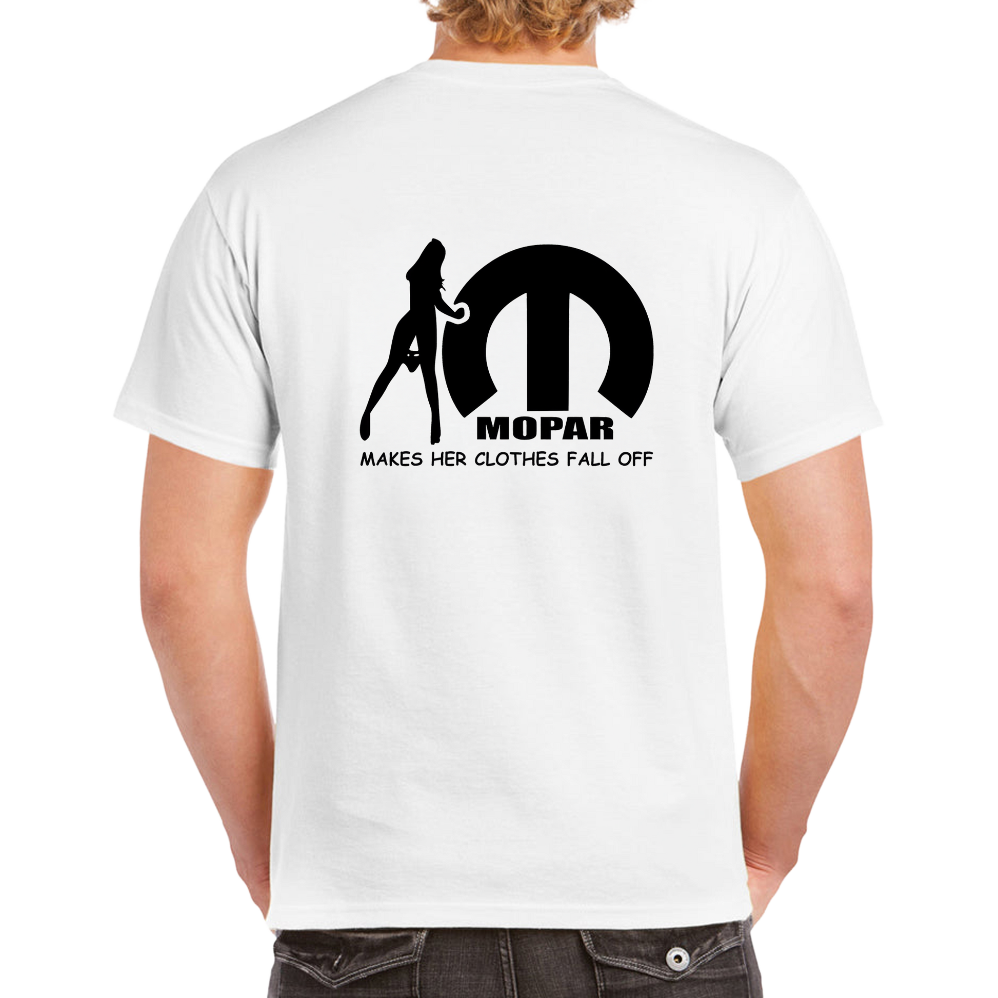 This design features the iconic Mopar logo alongside a classic pin-up silhouette, paired with the playful line “Mopar Makes Her Clothes Fall Off.” It’s a tongue-in-cheek nod to old-school garage humour and the legendary reputation Mopar muscle has earned over the years.