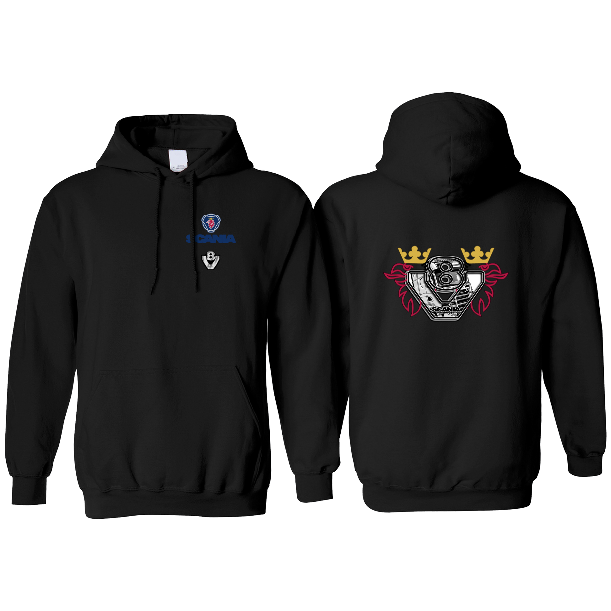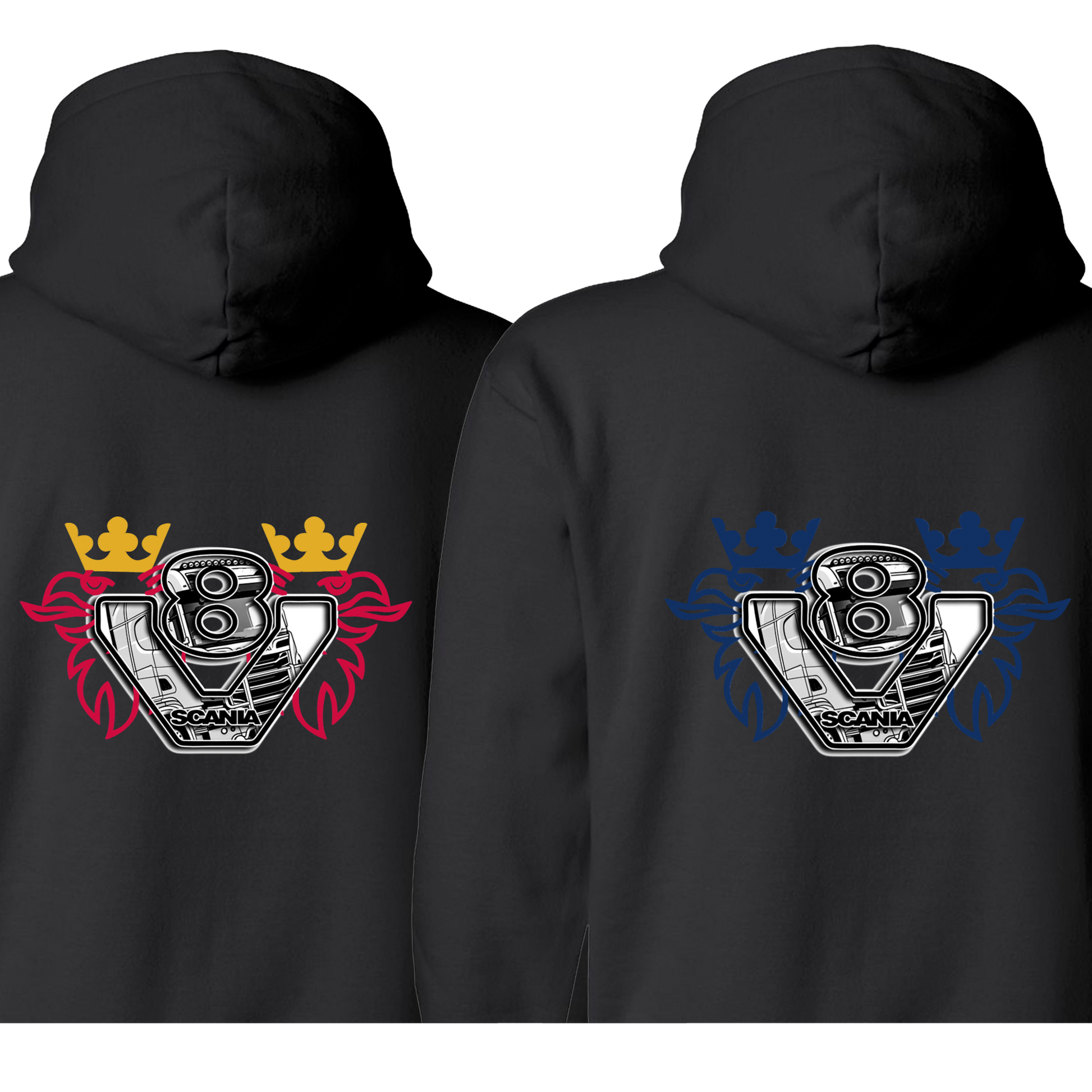 Scania V8 Power Hoodie, Perfect for all Scania fans. Two Different color sets for the back logo. One is all in the Scania Blue Scheme, the other incorporates the Scania Red & Yellow.